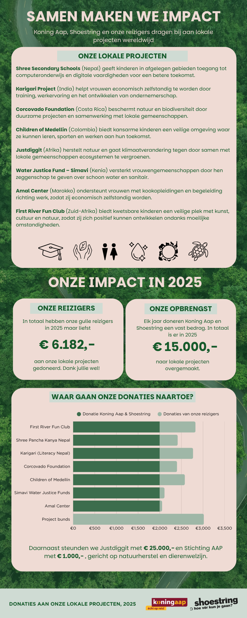 Zoals gezegd is er in 2025 maar liefst € 15.000,- aan de lokale projecten overgemaakt, waarvan € 6182,- door onze gulle reizigers. We kunnen daarom wel stellen dat onze reizigers echt hun hart op de juiste plek hebben zitten! Het First River Fun Club project was dit keer het populairste duurzame project onder onze reizigers, maar verreweg de meeste donaties zijn gedaan aan de bunds van Justdiggit.