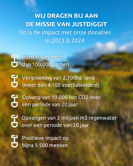 In het eerste jaar van onze partnership met Justdiggit (2023) hebben we een donatie gedaan waarmee naar verwachting de volgende impact kunnen realiseren: