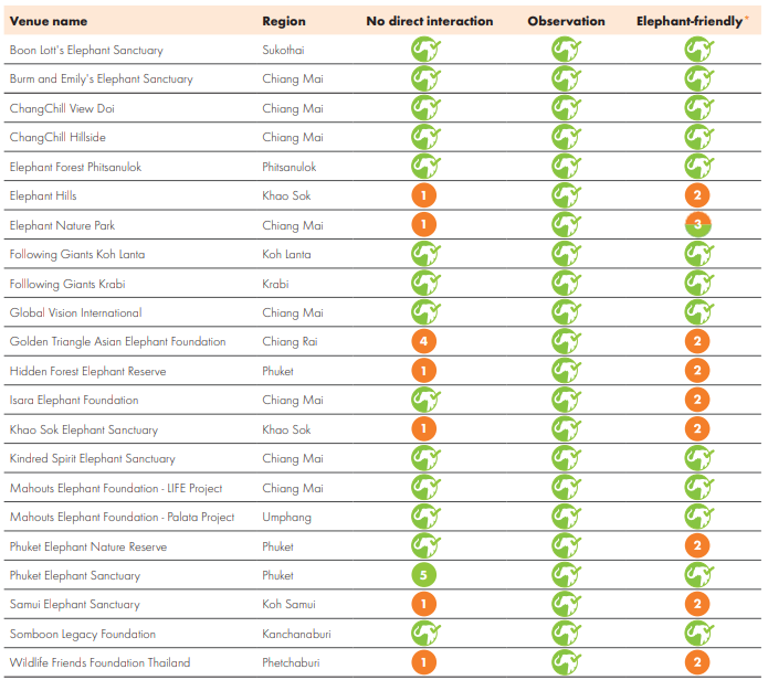 Locaties in Thailand waar olifanten in gevangenschap worden gehouden voor toerisme, die de hoogste scores behaalden in de beoordeling van WAP 2024/25. Geen van deze locaties biedt shows, ritten of wasbeurten aan. Bron: Bred to Entertain (2026).