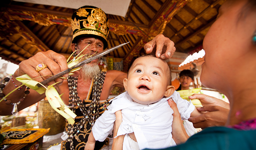 Een oude traditie op Bali concentreert zich rond het begraven van de placenta, een orgaan waarvan sommige hindoes denken dat het ‘leeft’, bijna als een tweeling van de pasgeboren baby. De placenta wordt gereinigd, in een container geplaatst en buiten het huis begraven. Ook mag de baby de eerste drie maanden de grond niet aanraken. De eerste maanden zijn heilig omdat de verbinding van een baby met de geest intact blijft. Daarom worden baby’s als een soort god behandeld.