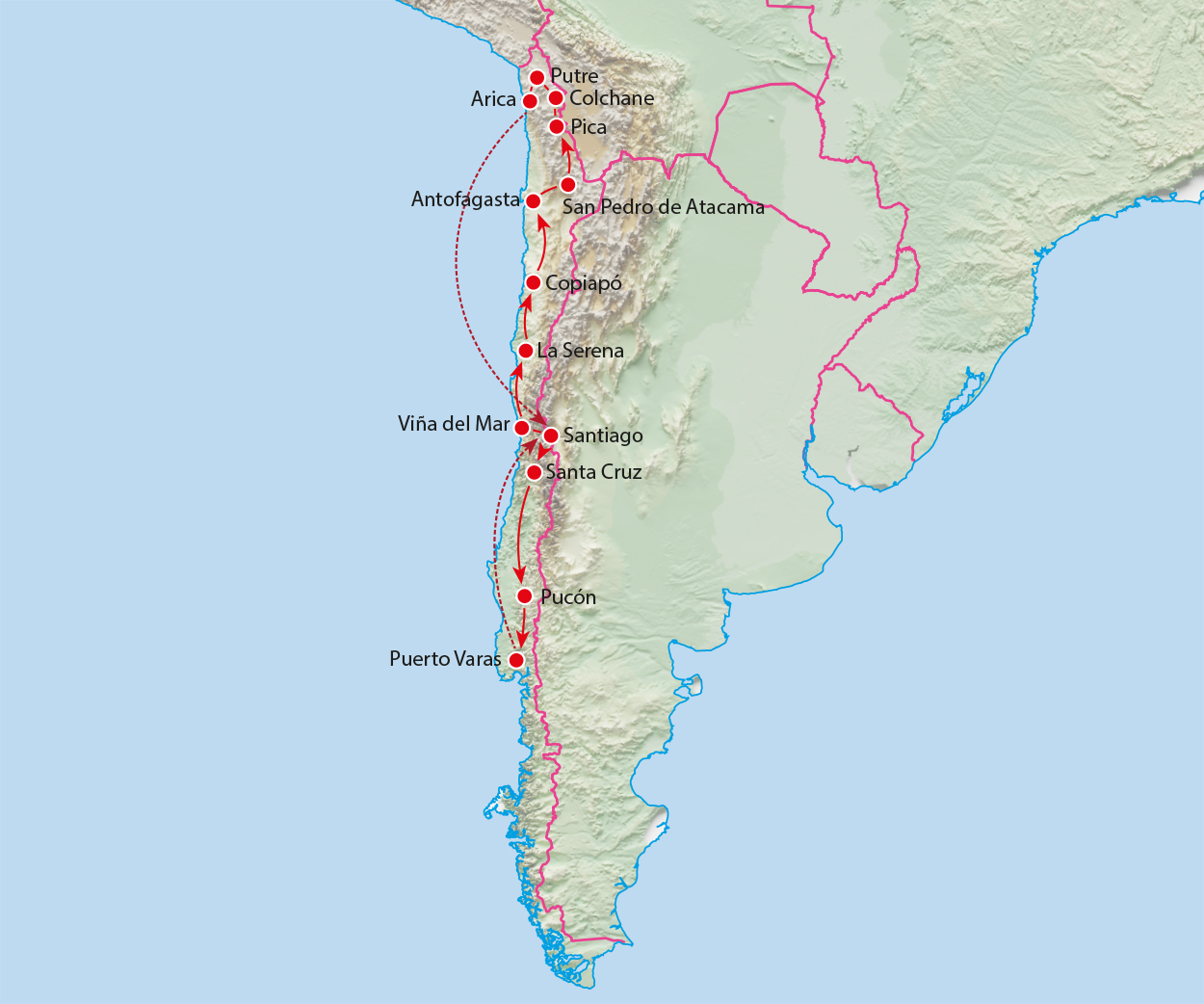 De kust van Noord-Chili heeft het hele jaar een lenteachtig klimaat. Santiago de Chile kent een klimaat met de aangename temperaturen van 20-25°C in de periode van september tot en met april.